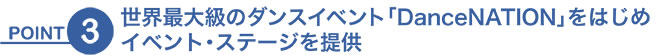 日頃の成果を発揮する機会として様々なダンスイベントを企画・運営しています。年に1度全国の受講生を対象に開催するダンスイベント「Dance NATION」は、3万人以上を動員し世界最大級の規模で開催しています。また地域別に行う「Dance KINGDOM」も地域最大級の規模で開催しています。